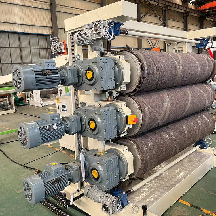 Hartplastische PVC-Blatt-Extrusionslinie-vertikale Drei-Roll-Kalendermaschine: Eins A. Struktur der Kalendermaschine: vertikale drei Rollen (mit Roller -Sicherheitsschutzvorrichtung) B. Anzahl der Walzen; drei (produziert in Qingdao) C. Trommeldurchmesser: 40 0 mm D, Rollenlänge: 12 0 0 mm e. Wandstärke der Walze: ≥2 1 mm F. Rollenmaterial: 45# Stahl wird verwendet und die Härtungsbehandlung wird durchgeführt, und die Härte kann RC60-65 erreichen G. Rolleroberfläche Behandlung: Spiegelbehandlung H. Trommelstruktur: Multi-Layer Composite Rapid Exchange System wird angewendet, um eine gleichmäßige und konstante Temperatur der Trommel zu gewährleisten. I. Konstante Temperaturmedium der Walze: weiches Wasser J. Drei-Roll-Steuerungssystem: Die Frequenzumwandlungsregelung wird angewendet, um die synchrone und unabhängige Geschwindigkeitskontrolle zu realisieren. K, Übertragungssystem: 1,5 kWX3 = 4,5 kW, sorgen Sie für den reibungslosen Betrieb der drei Walzen.