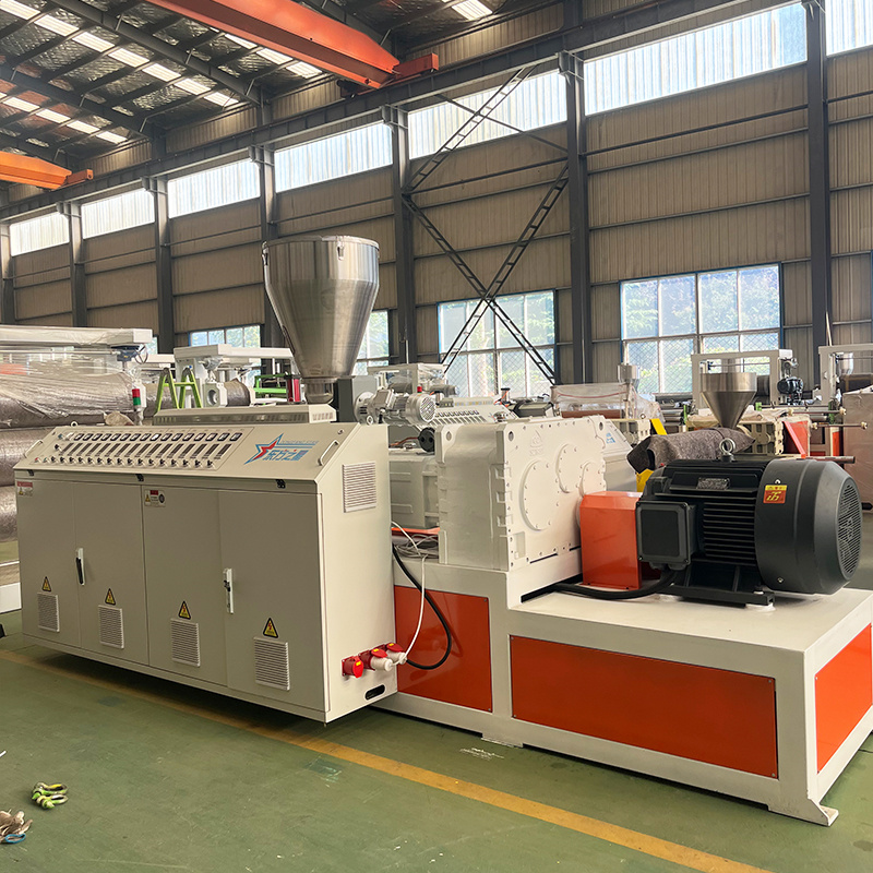 Qingdao Eaststar Plastic Machinery Co., LtdDie konischen Doppelschneckenextruder von ., zeichnen sich durch gleichmäßiges Plastifizieren und Mischen, hohe Leistung, stabile Qualität, große Anpassungsfähigkeit, lange Lebensdauer und direktes Formen von PVC-Pulver aus. Ausgestattet mit entsprechenden Formköpfen und Zusatzgeräten können verschiedene thermoplastische Kunststoffe, insbesondere Hartpolyvinylchloridpulver, direkt zu Kunststoffprodukten wie Rohren, Folien, Platten, Stäben, Folien und Profilen extrudiert werden. Es kann auch die Modifizierung verschiedener Kunststoffe und den Granulierungsprozess von Pulver abschließen. Der konische Doppelschneckenextruder hat eine stabile Leistung und kann die Schmelze gut plastifizieren und bei relativ niedriger Temperatur extrudieren. Der Lauf ist mit einer Aluminiumgussheizung ausgestattet, die einen hohen thermischen Wirkungsgrad, eine schnelle und gleichmäßige Erwärmung und einen Kühlventilator aufweist.